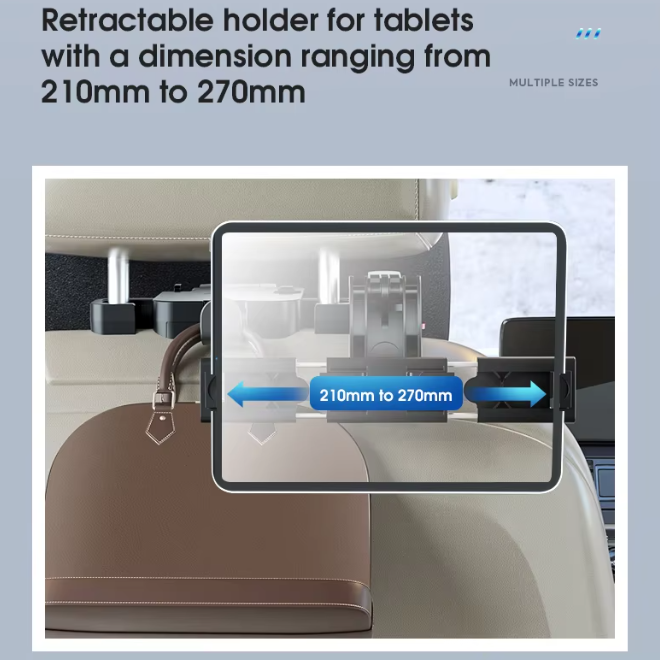 Feature: Retractable holder for tabletswith a dimension ranging from 210mm to 270mm. Detachable Phone Tablet Holder and Foldable Hook.